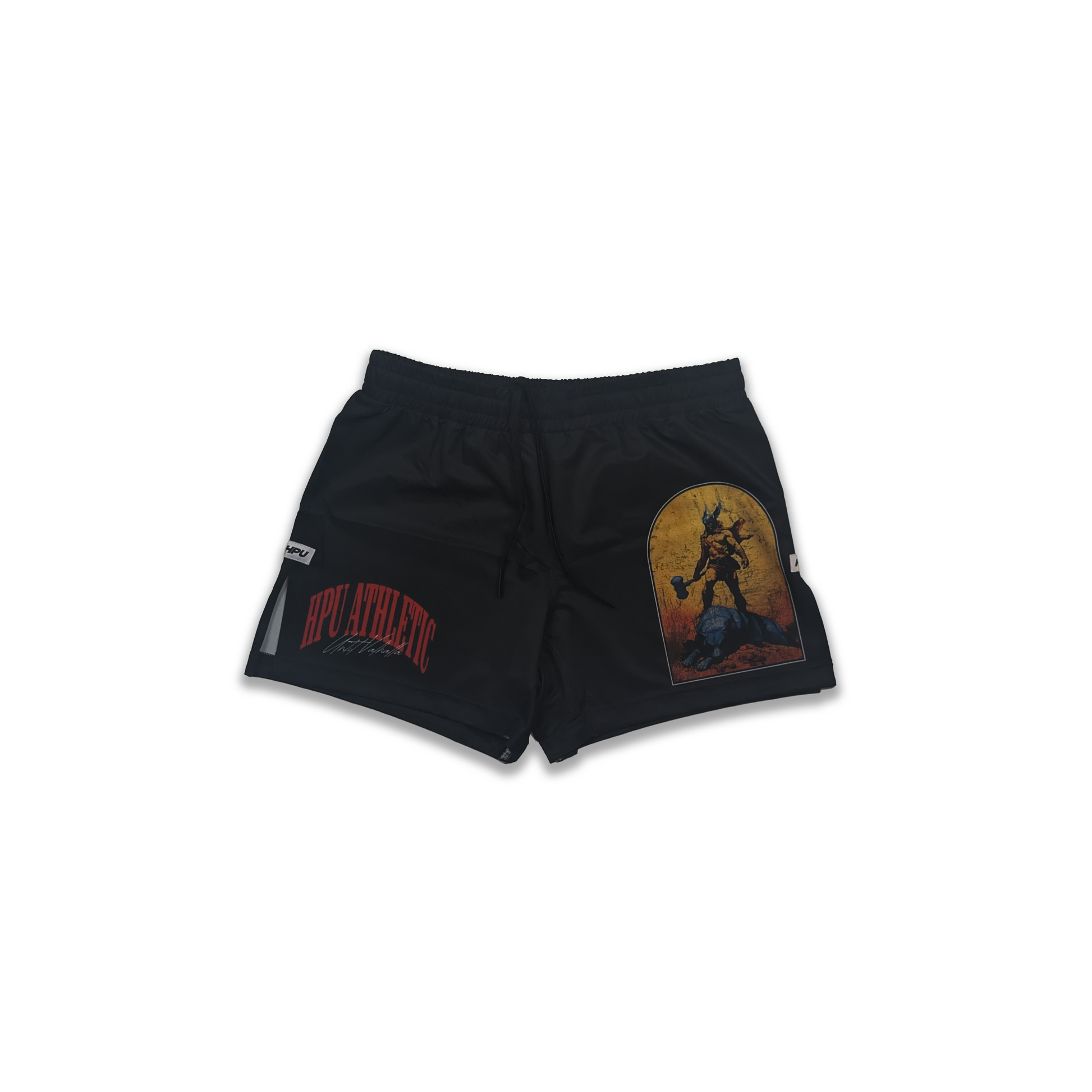 The shorts feature a bold, asymmetric design. The right leg displays a vivid, full-colour graphic panel depicting the warrior's ascent, while the left leg is finished with the HPU Athletic wordmark in a striking crimson red. A secure elastic waistband and side-split hem ensure a locked-in fit for the rigours of combat.