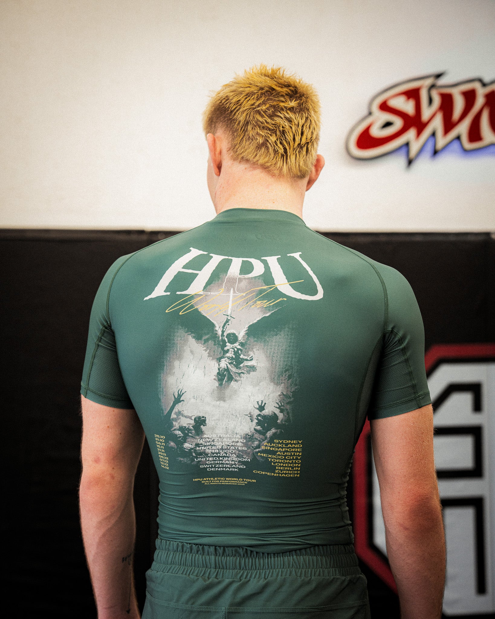 It is built from our signature 200gsm performance blend, engineered with a competition compression fit that moves with the body. The back features the full tour graphic in a muted, stone-coloured print, giving it an understated, vintage feel. The front is finished with the HPU World Tour logo.