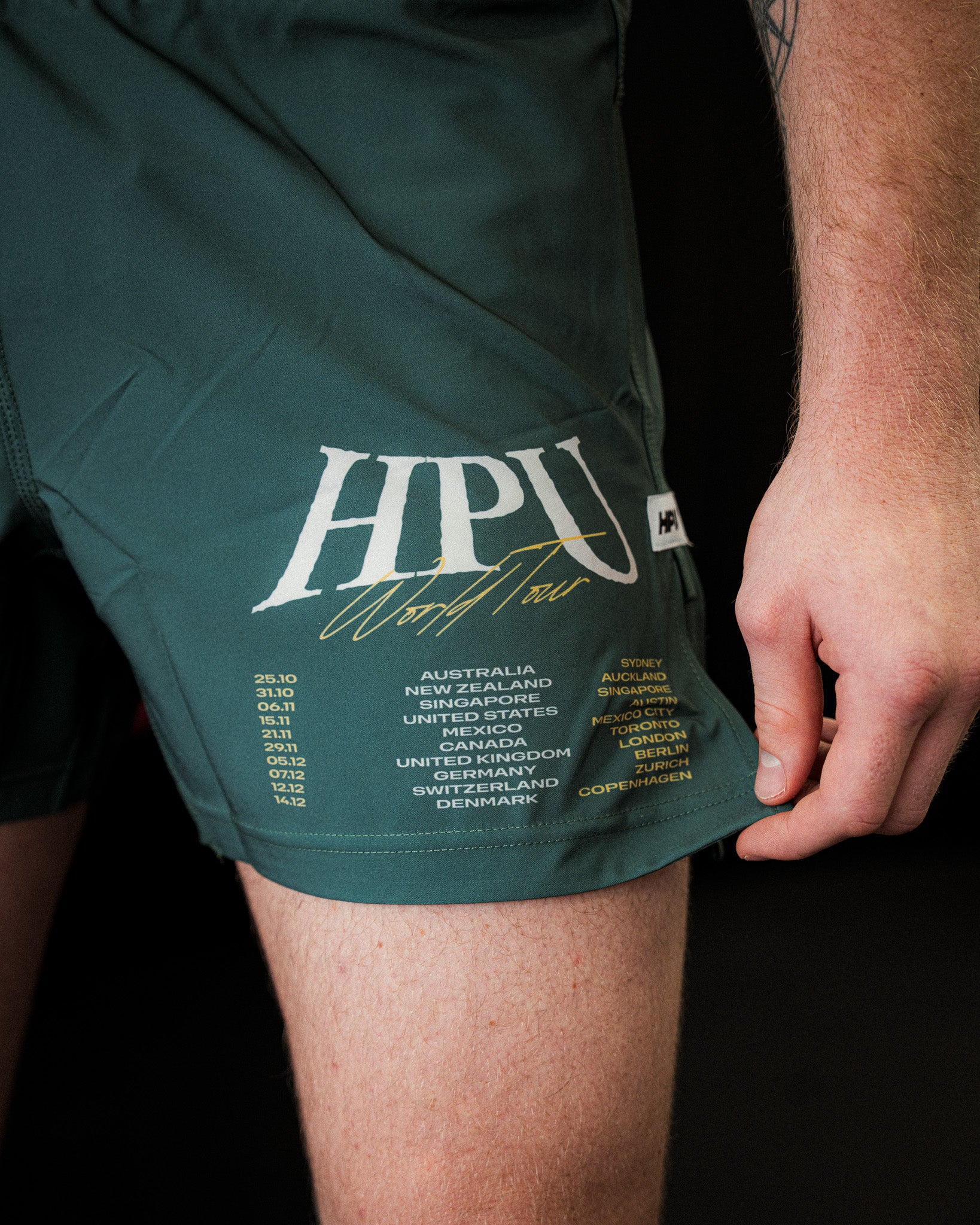 The shorts feature the full World Tour graphic set, including the tour logo, global graphic, and Team HPU city list, all rendered in a vintage cream and yellow print. A secure elastic waistband and side-split hem complete a short that is built for the rigours of a world tour.